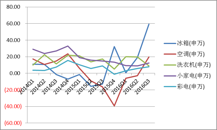 相比地产15年开始销售额加速上升,家电销售自2016年开始加速放量,尤其空调与冰箱回升幅度明显。
